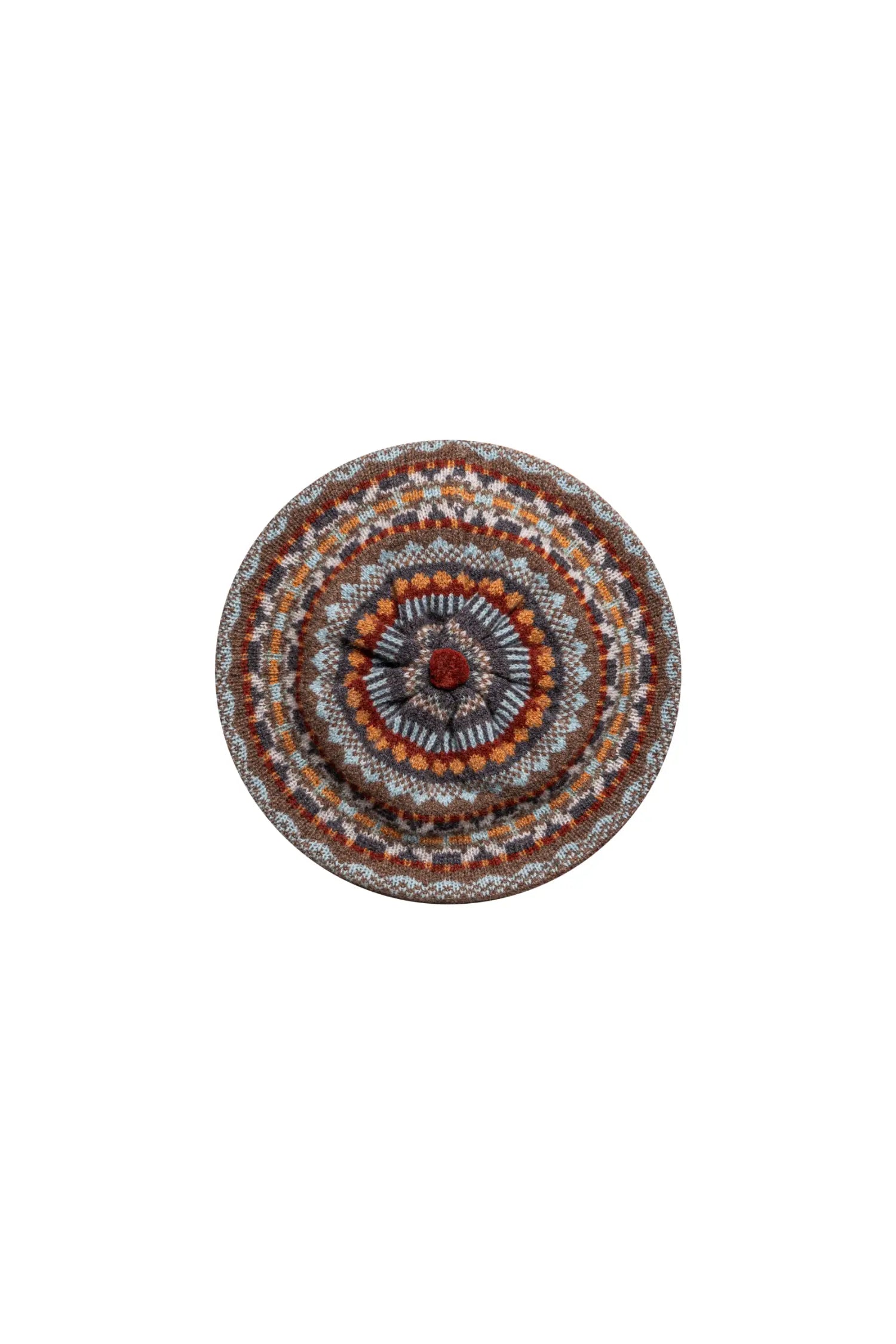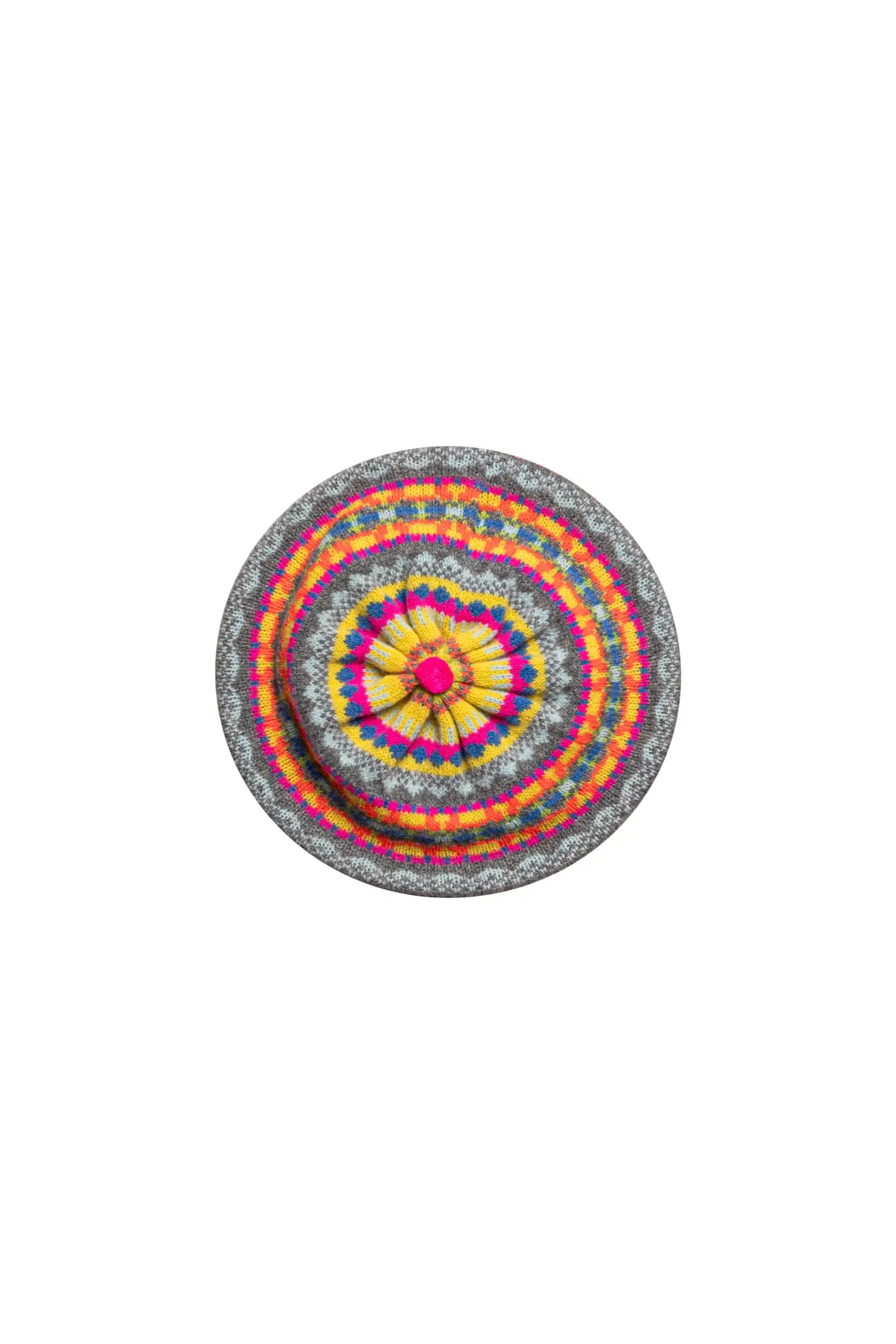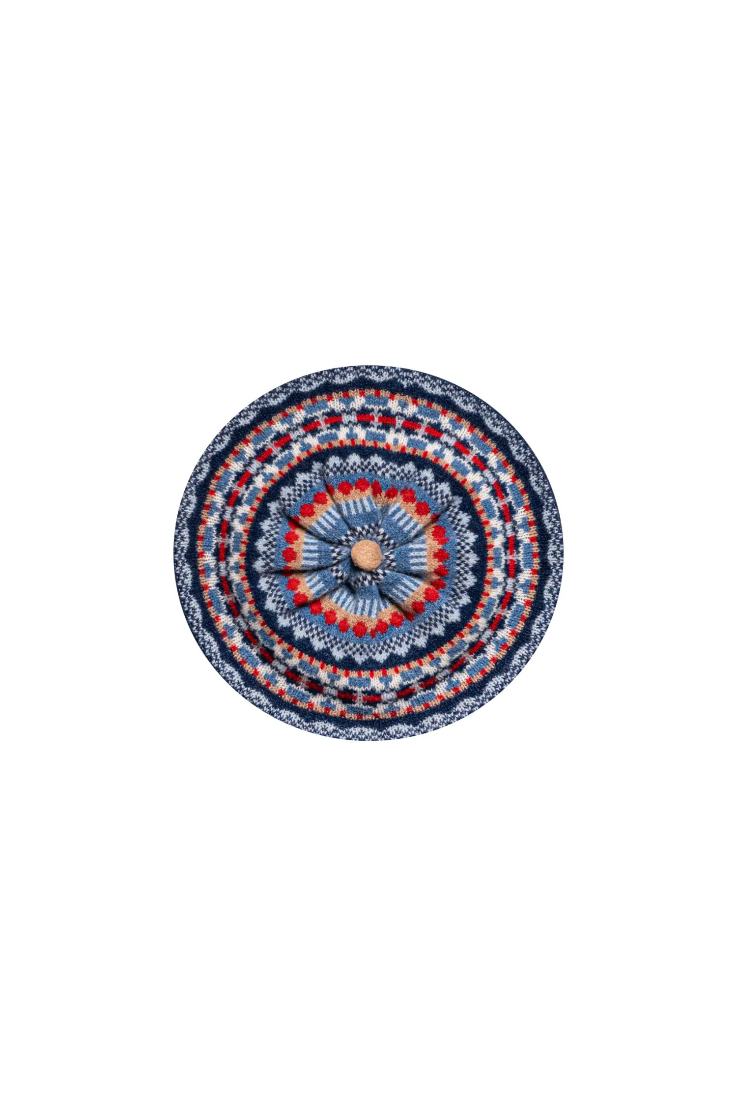 Circular knit Fairisle beret with a small pom-pom and rib hem. It can be worn like a beanie or in true French style