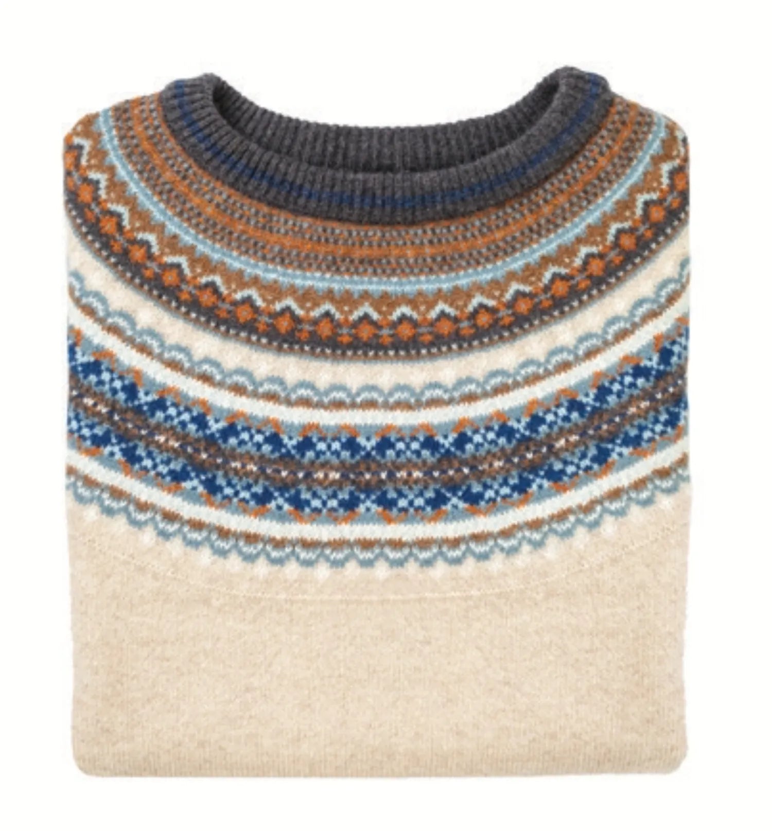 Our classic Fairisle yoke pullover is simplified and reimagined in a looser shape for a relaxed fit, featuring firmer, thicker and more defined ribs. Available in two sizes, designed according to height. The Fairisle pattern appears only on the shoulders, with the rib cuffs and hem in the main colour.