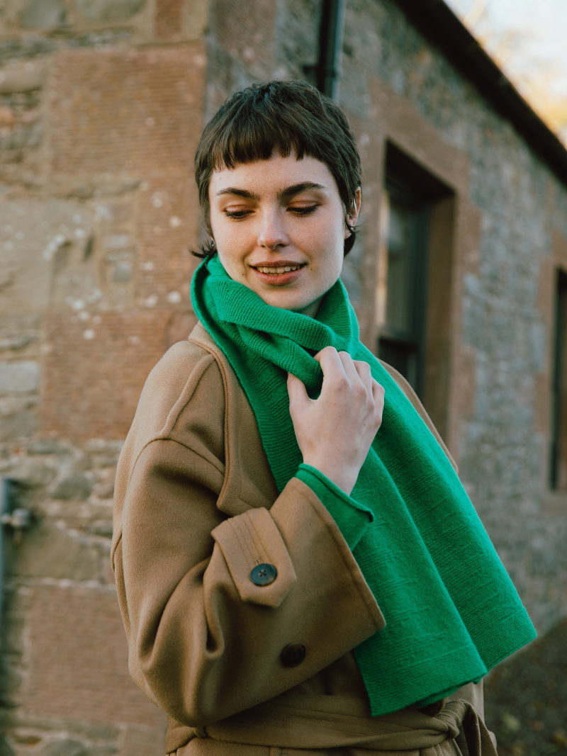 A new practical and easy to wear garment. Trimmed with an attractive, irregular textured garter stitch that can be folded like a collar around your neck. Wear like a cape, a scarf, a shawl, or as a knee blanket. Highly recommended for those who feel the cold.