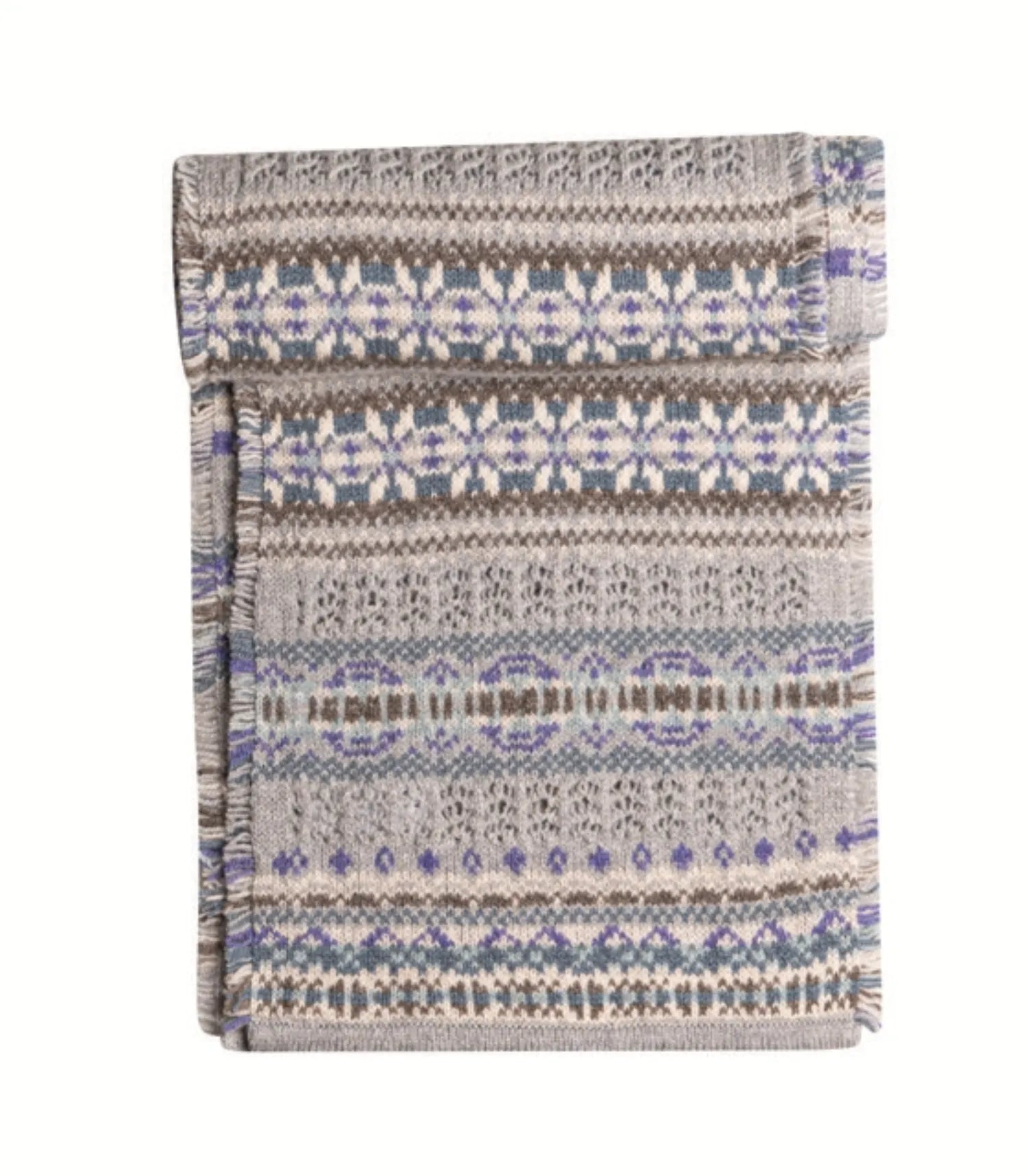 This luxurious, soft scarf blends the romance of lace with blended colourful Fairisle patterns in a new Scottish heritage design. Wear it as a scarf, shawl, knee rug, or wrap it around your head and neck to keep you cosy.
