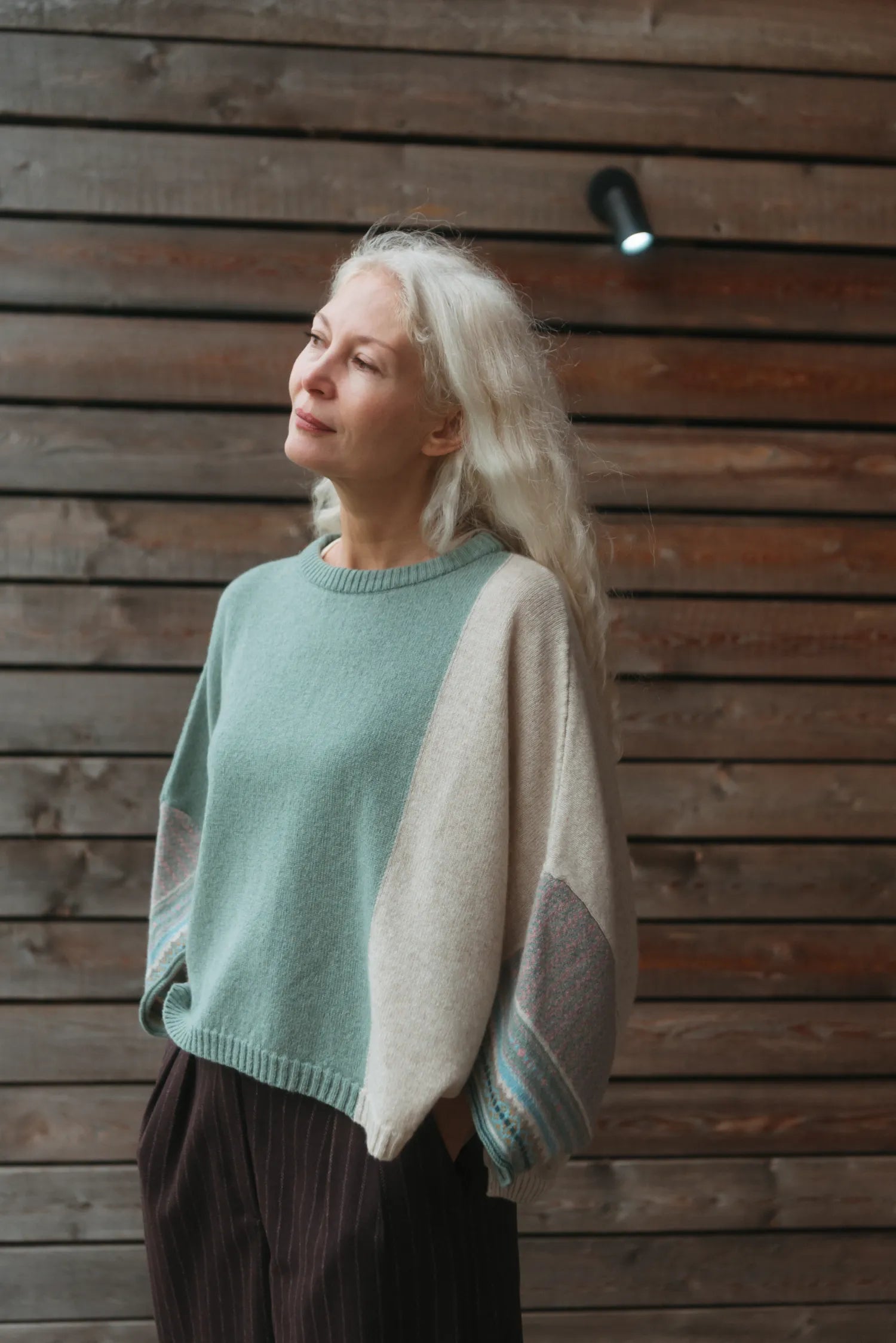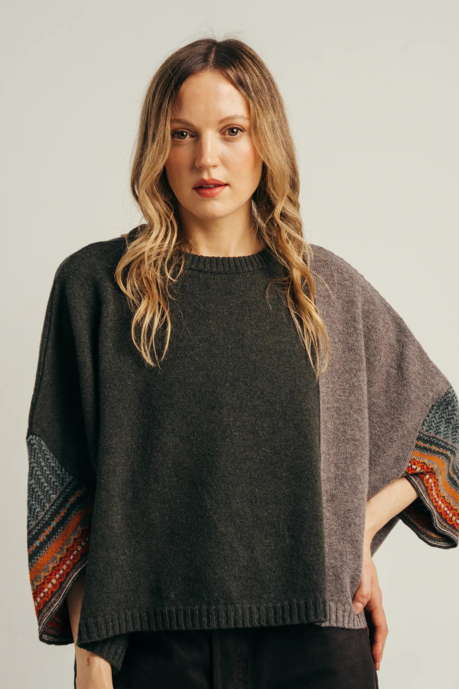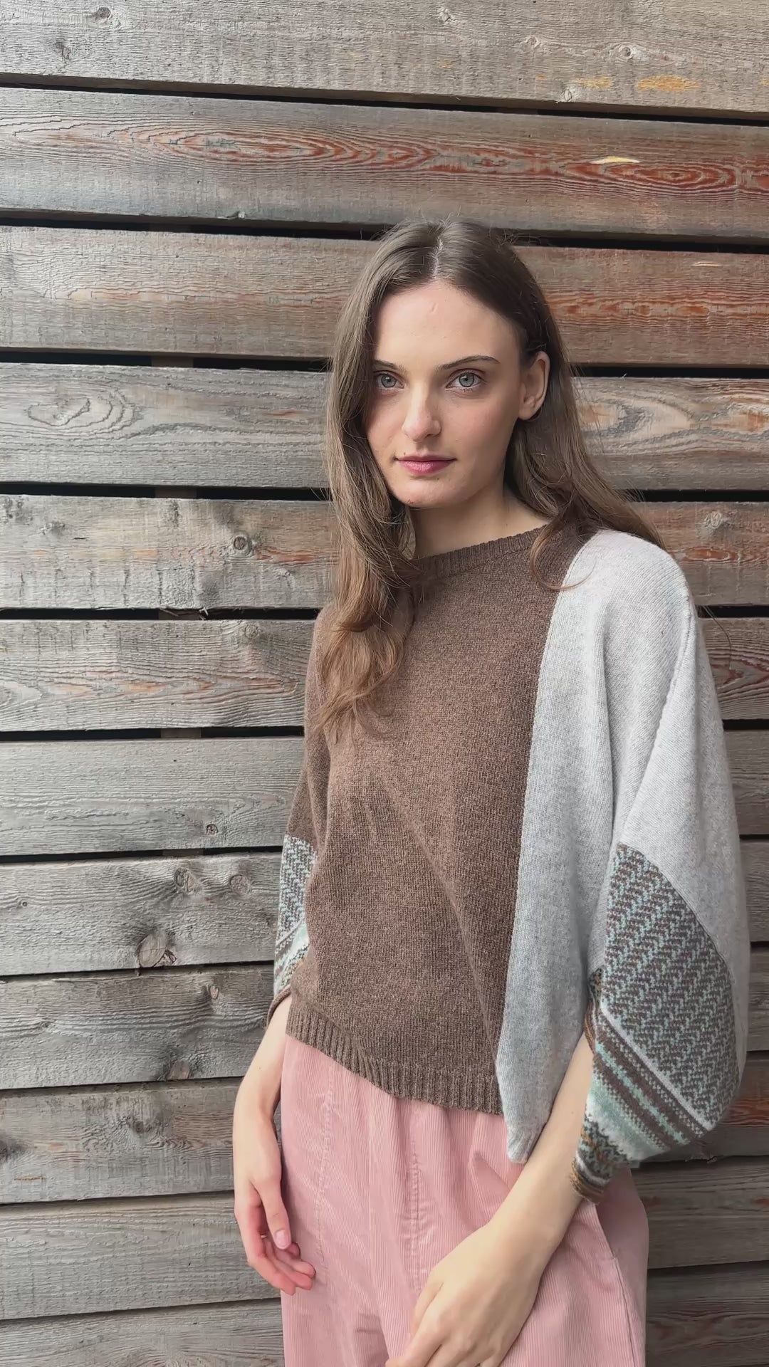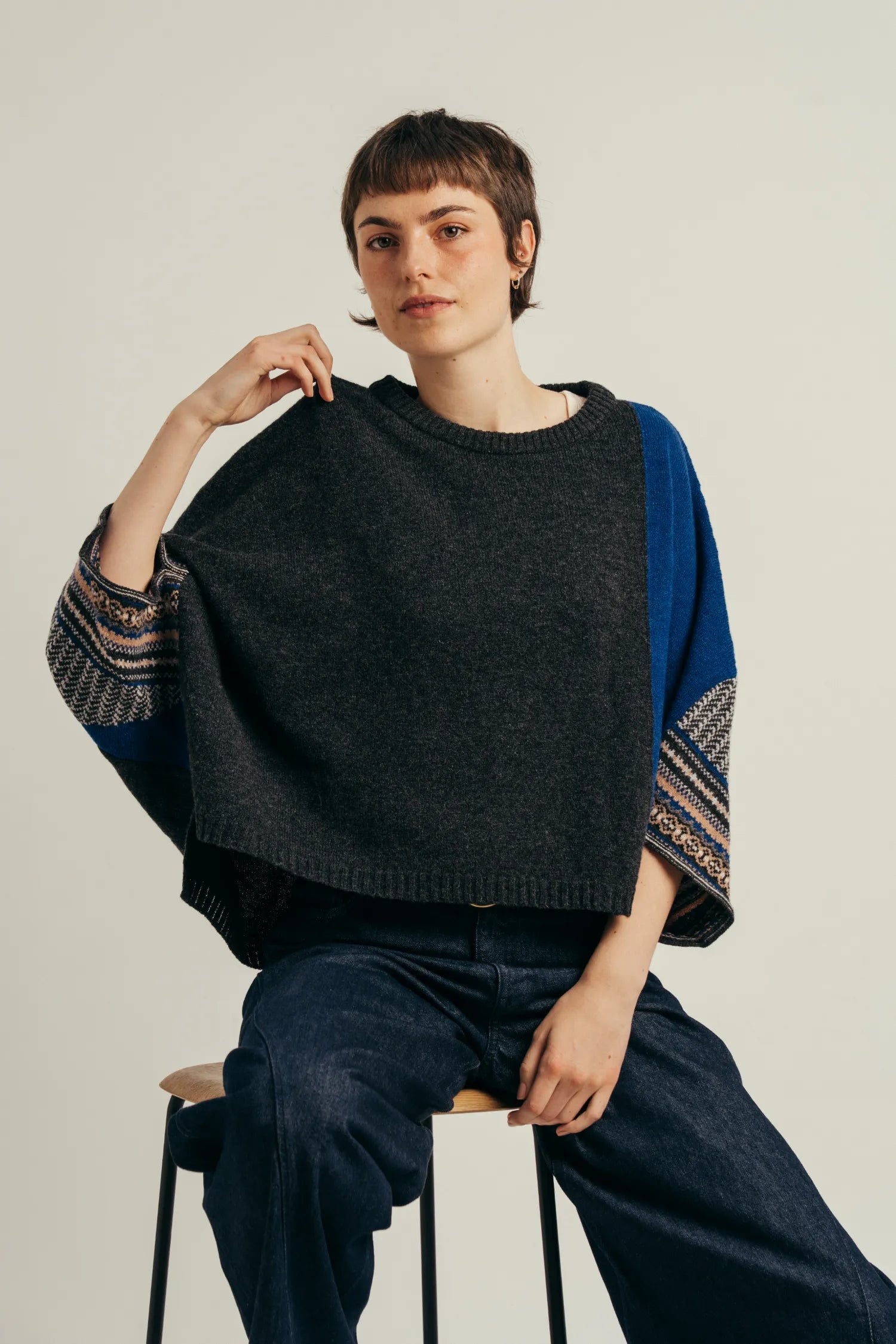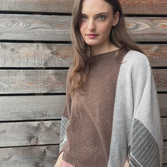 A must-have garment that you can throw on for effortless comfort and style. This versatile hip-length top features a loose, flattering draped shape and short sleeves with subtle Fairisle and tweed pattern details. It offers lightweight warmth and a universally flattering fit. Available in two sizes, designed according to height.