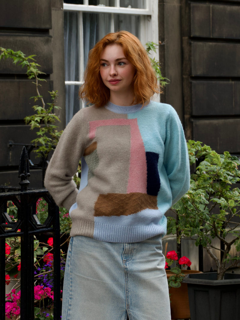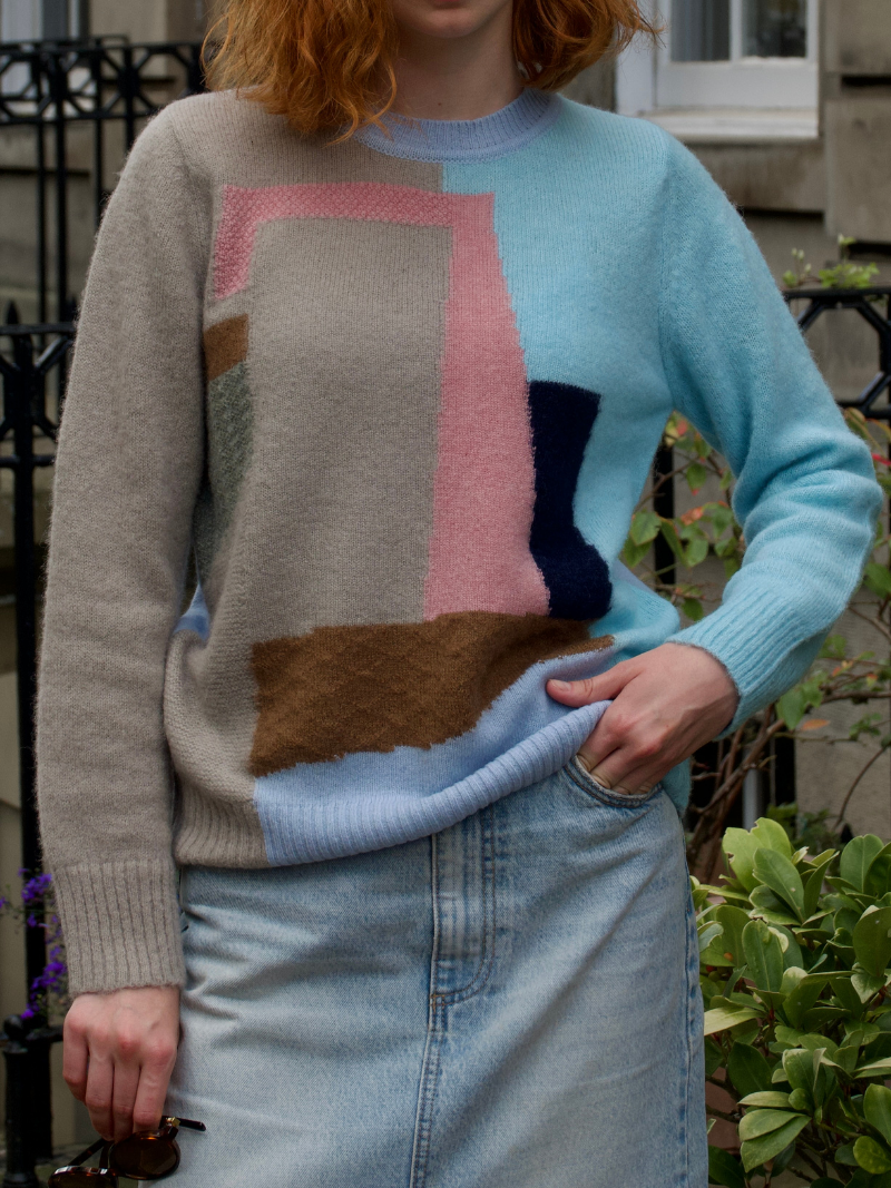 Soft and luxurious, with panels of texture and alternating yarn. The sleeves and reverse are knitted in soft Merino wool block colour. The colour panels on the front are made up of a variety of yarn with soft fluffy texture changes and stitch pattern changes. With generous ribs to ensure a flattering fit.
